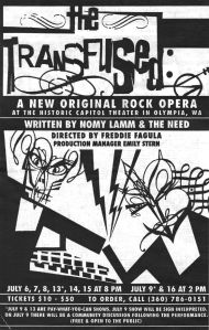 During the show’s run we sold out The Capitol Theater every night but the impact was even greater than that. Like The Spearhead Sound Hours Benefit, The Transfused involved so many people that it felt like the whole town was in on the ritual. There was talk of taking it to Broadway and I am sure if they had, it would have stood a shot at Hedwig-style success. Sadly, like so many Olympia projects, The Transfused and its creators could not contend with the dangers of commercial success, so the production went no further than the city limits, and today it lives on only in the videos from its one production, and in the memories of those who were there. Even more disheartening for me, once the production ended, that sense of inclusion I had enjoyed dissipated and I faded back into the white woodwork of Olympia with most of my former collaborators walking past me on the street without any sense of kinship between us.