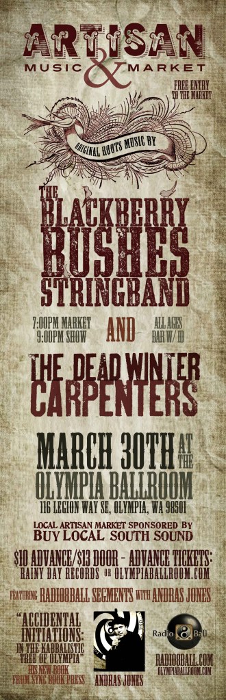 I woke up early this blustery morning, to send off the last edit of AI to the printers, and was synchronistically jazzed to receive this latest petition from members of The Olympia Film Society. It looks like some of the old familiar characters at OFS are up to the same kind of sneaky power grab I describe in my book. With the above petition, the membership is trying to do something about it. I wish them luck, and I wish Accidental Initiations was here today to aid them in their cause. It should be available online by March 19th (the spring equinox) and I will have copies for sale when I host The Blackberry Bushes Stringband and The Dead Winter Carpenters show at The Olympia Ballroom inside The Olympian Hotel on March 30th.